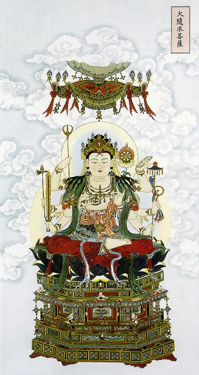 (菩萨)具名大随求菩萨,胎藏界曼陀罗中观音院之一尊,观音菩萨之变身别名也。念此菩萨,诵其真言,则随众生之求愿而施与,故名随求。其真言曰随求陀罗尼。秘藏记末曰:'大随求菩萨,深黄色,并有八臂,左上手莲华上有金轮光炎,次手梵筴,次手宝幢,次手索,右手五钴跋折罗,次手镑鉾,次手宝剑,次手钺斧钩。'大钞二曰:'理性院习云:随求观音别名也。'